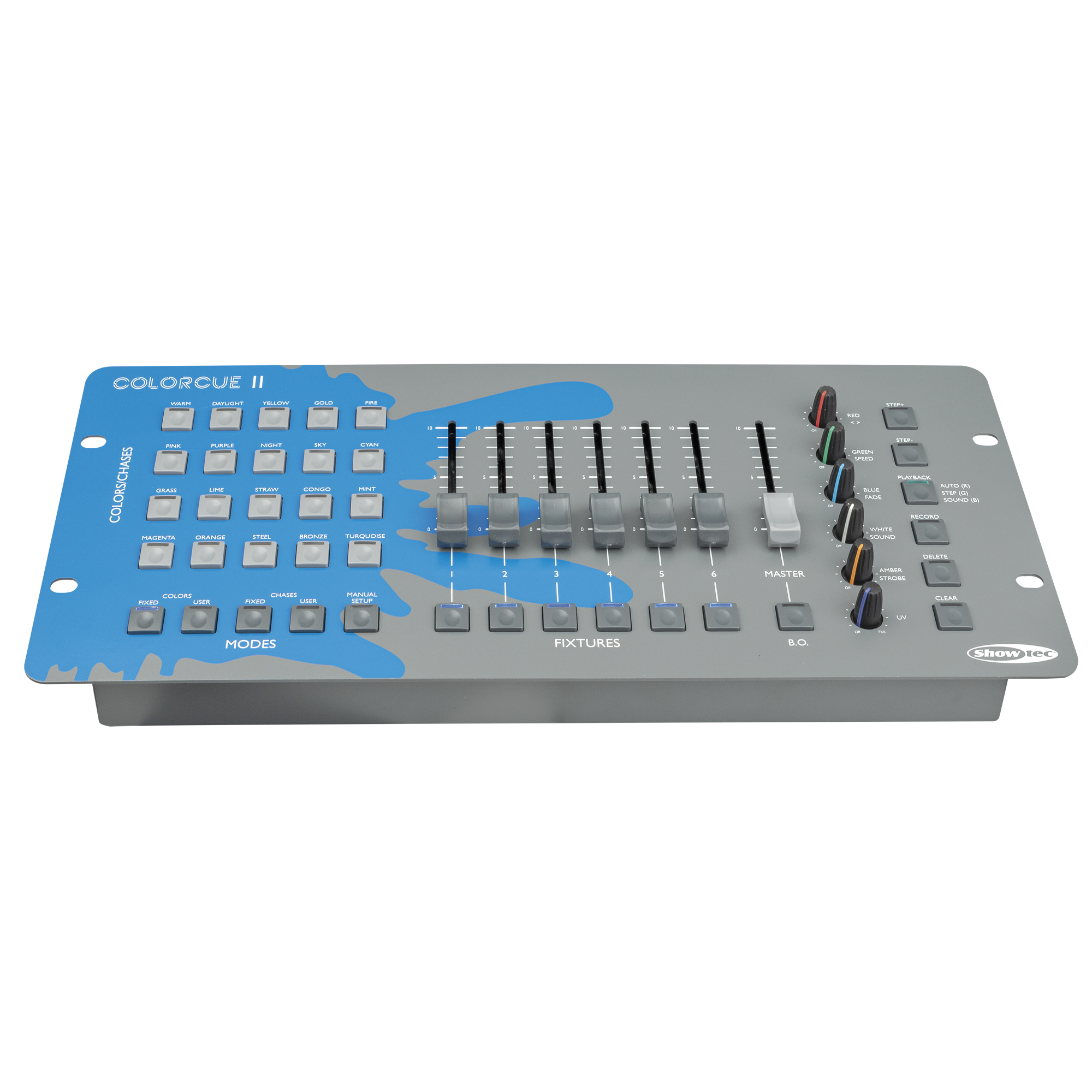 Der Showtec ColorCue 2 ist ein intelligenter 6-Fader-LED-DMX-Controller mit 36 Kanälen zur einfachen Steuerung der Lichtausgabe von LED-Scheinwerfern mit bis zu 6 Farben (RGBWA-UV), geeignet für jeden Veranstaltungsort. Mit seinen 6 Potentiometer können Sie die Lichtleistung für jeden Fader schnell auf die gewünschte Farbe einstellen, von 3-Farben-RGB bis 6-Farben-RGBWA-UV. Der ColorCue 2 ermöglicht es Ihnen, Ihre eigenen 20 voreingestellten Farben zu erstellen und zwischen 20 vorprogrammierten Farben zu wählen. Sie können bis zu 20 Programme (Chases) erstellen oder die 20 vorprogrammierten Chases mit jeweils bis zu 99 Schritten für wechselnde Farben und Effekte in einer Schleife nutzen. Die Chases können entweder im Modus „Manuell“, „Autolauf“ oder „Soundgesteuert“ gesteuert werden.