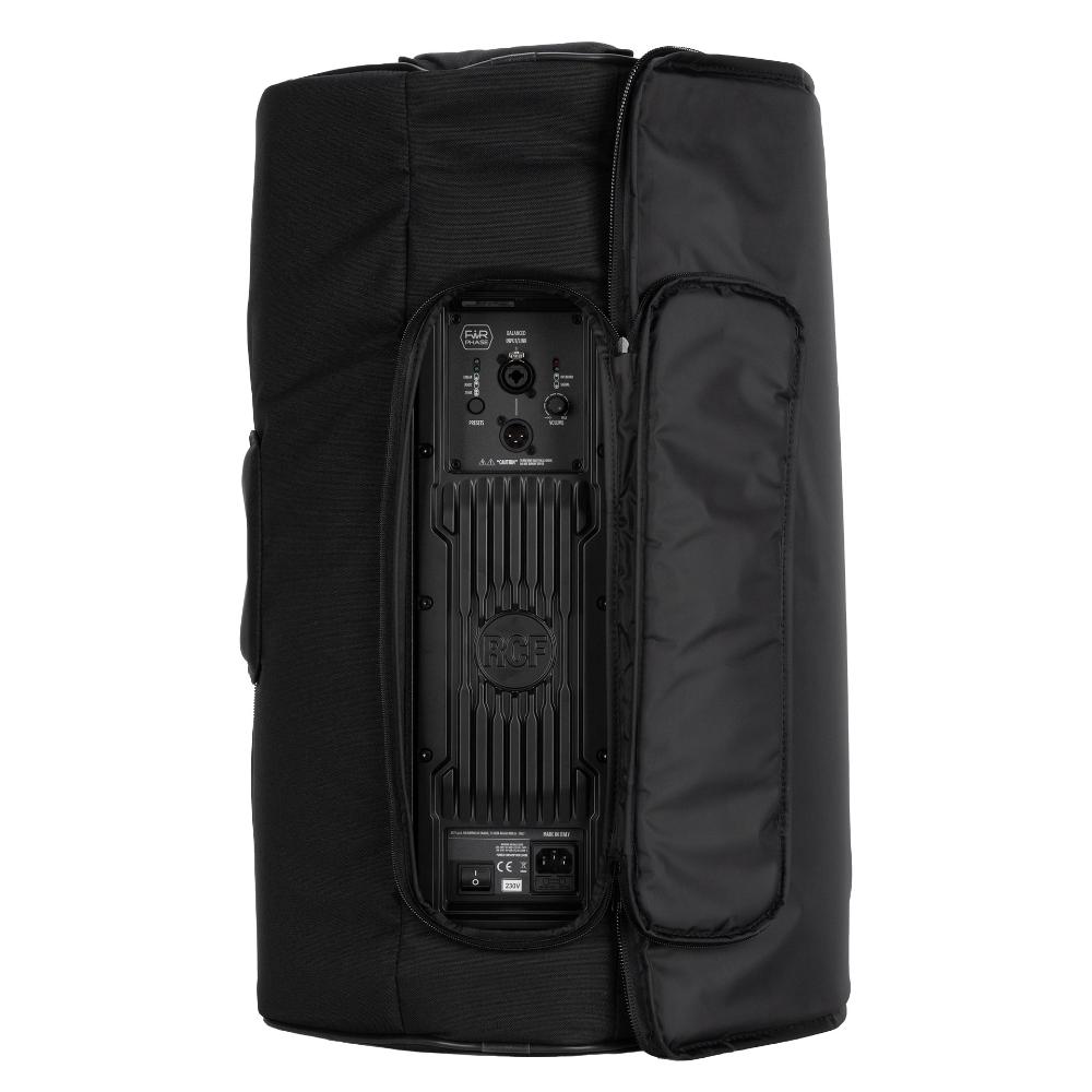 Padded Cover for ART 9 Series 15″ models. It features heavy-duty weatherproof polyester outer fabric, foam rubber padding, and zip openings with Velcro fasteners. The frontal cover can be opened and blocked with velcro on one side. It features multiple openings for handles, for the rear connection panel, and the pole mount cap.